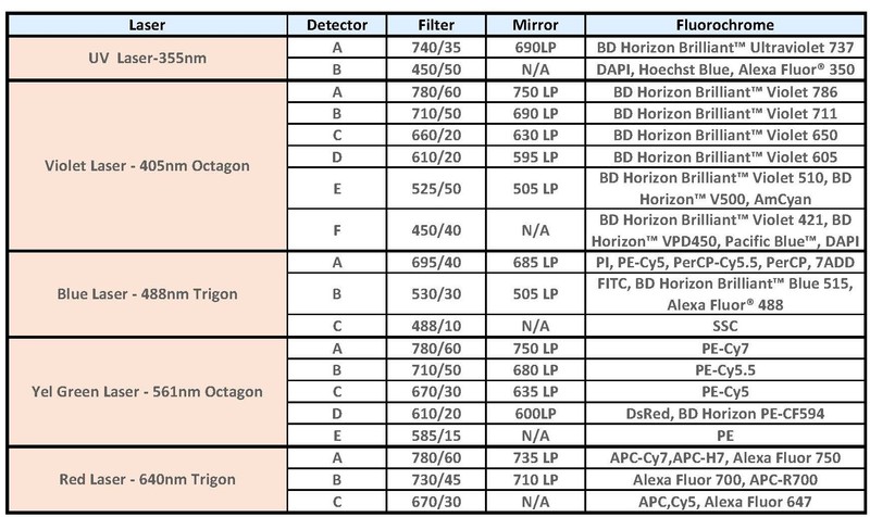 5 lasers (with excitation wavelengths of 355, 405, 488, 561 and 640 nm), 20 parameters can be measured, and 18 kinds of fluorescent wavelengths can be detected at the same time. The filter is used as shown below. There are other fluorescent filters to replace. For more information, please contact the administrator.