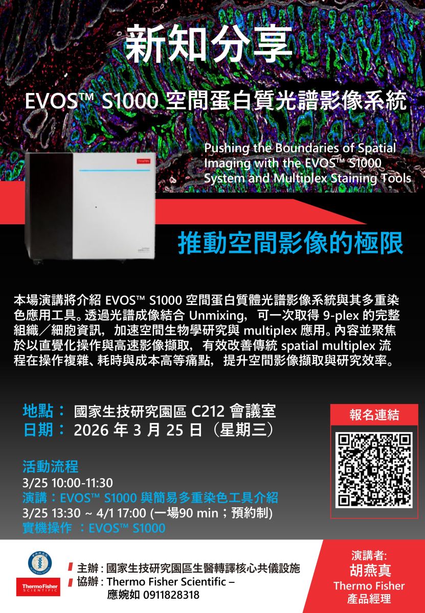 The Core Facilities for Translational Medicine at the National Biotechnology Research Park is pleased to collaborate with LIFE TECHNOLOGIES CO., LTD. and Thermo Fisher Scientific to host a scientific seminar and instrument demonstration. We cordially invite you to join this knowledge-sharing event featuring the EVOS™ S1000 Spatial Protein Spectral Imaging System and staining workflow solutions.